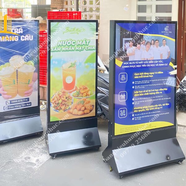 Bảng hiệu đứng thường được làm bằng chân sắt chữ A, chữ T và loại cao cấp có bánh xe dễ dàng di chuyển tùy theo vị trí muốn quảng cáo.
