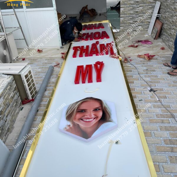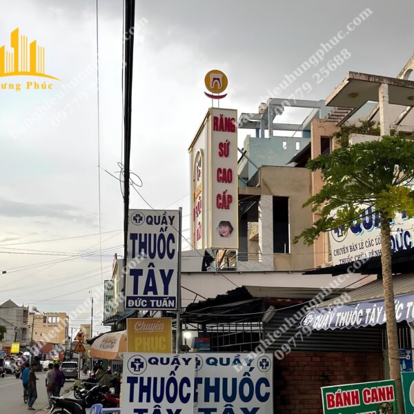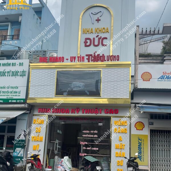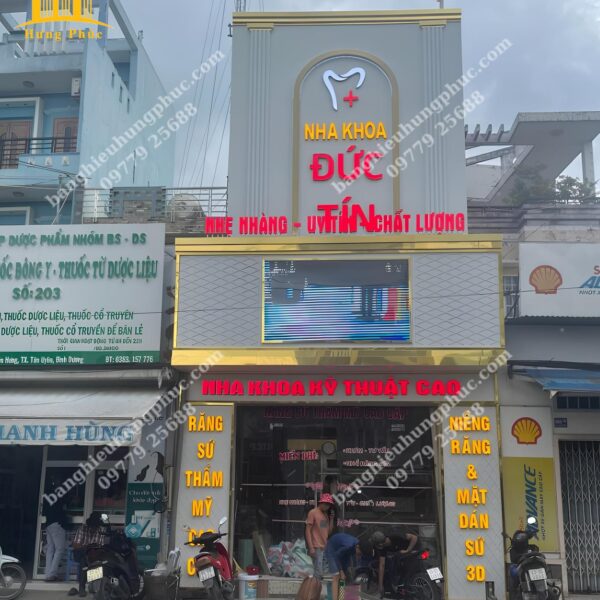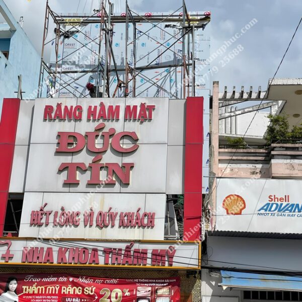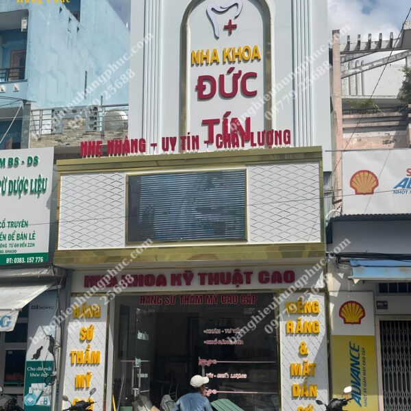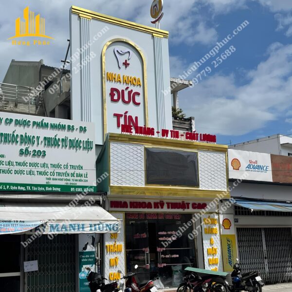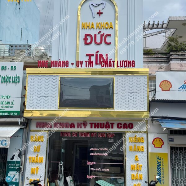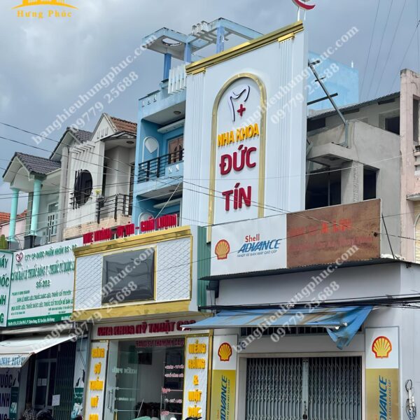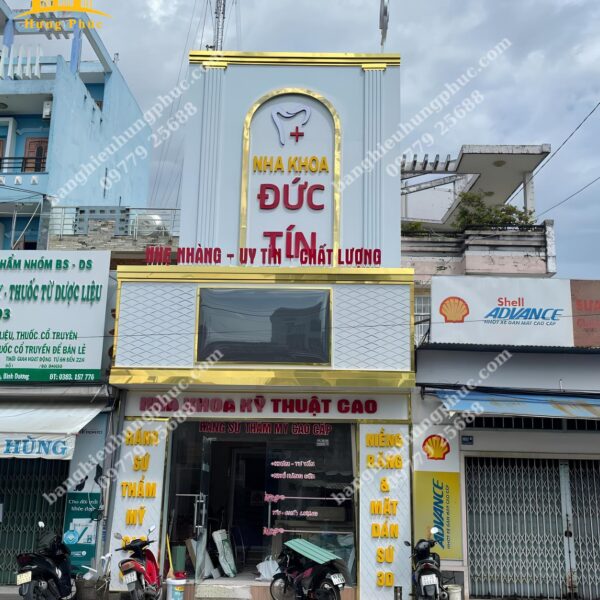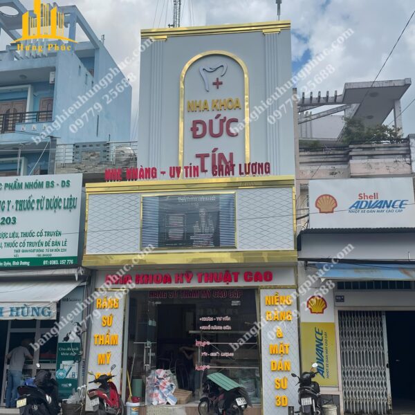Quảng cáo Hưng Phúc tận dụng khung xương sắt của bảng hiệu cũ đã xuống cấp, thiết kế thi công và bàn giao bảng hiệu mới cho Nha khoa Đức Tín với mái đón phía dưới kết hợp bảng alu chữ nổi viền inox vàng gương xung quanh bảng hiệu và biển vẫy hình chữ nhật phía trên bảng hiệu lớn làm cho Nha Khoa Đức Tín trở nên nổi bật, gia tăng uy tín và cũng cố lòng tin, thu hút khách hàng nhất khu vực.