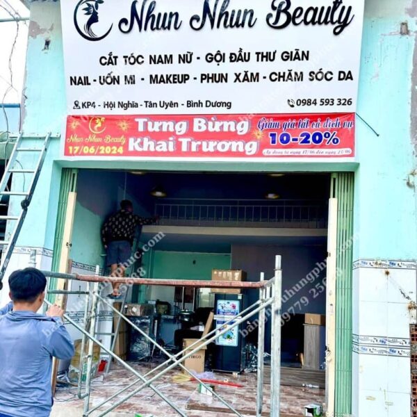 - Lắp đặt: Bảng Hiệu Hưng Phúc sẽ lắp đặt bảng hiệu tại vị trí đã chọn, đảm bảo dễ dàng thu hút sự chú ý của khách hàng. Chúng tôi sử dụng keo, khung, và ốc vít chất lượng cao để cố định bảng hiệu một cách chắc chắn và an toàn.
