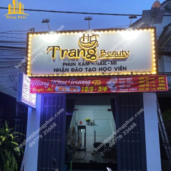 là bảng hiệu tiệm nail được làm từ hộp đèn có thể thay đổi nội dung thông điệp hoặc hình ảnh. Bảng có mặt trước là acrylic trong suốt, in logo hoặc thông điệp của tiệm nail và được chiếu sáng từ bên trong.