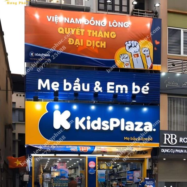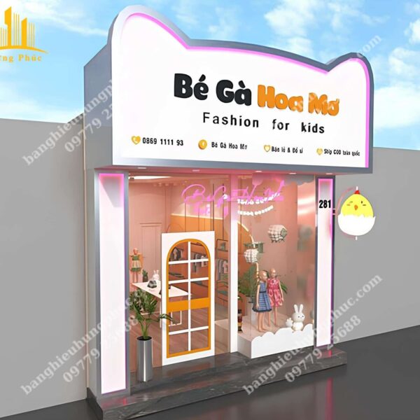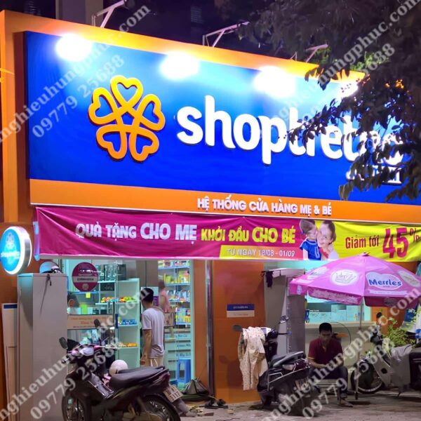 - Hộp đèn: Là cấu trúc bảng hiệu có đèn nền, thường sử dụng để chiếu sáng nội dung quảng cáo hoặc tên cửa hàng. Đối với shop mẹ và bé, hộp đèn giúp làm nổi bật thông tin và thu hút sự chú ý của khách hàng vào mọi thời điểm trong ngày.