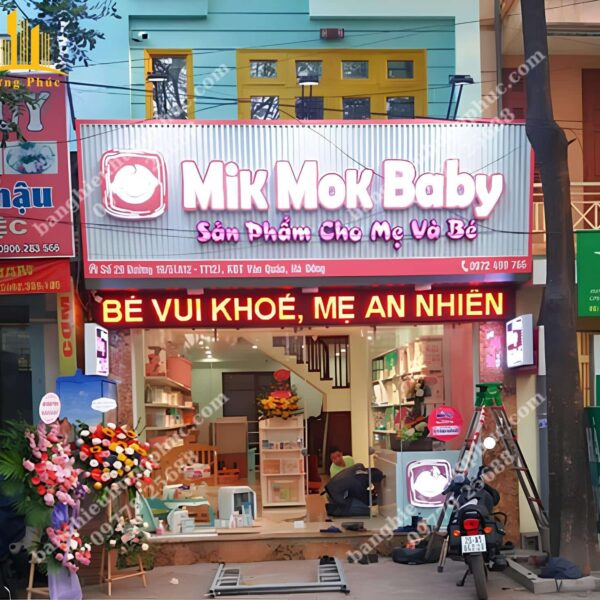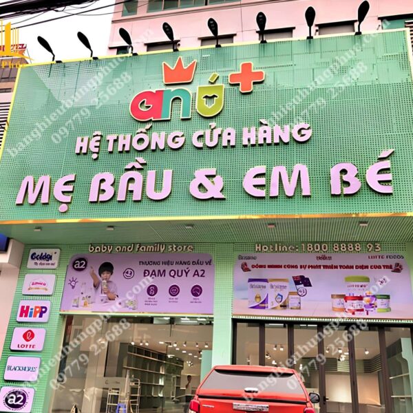 Biển hiệu chữ nổi shop mẹ và bé là loại biển quảng cáo có chữ cái hoặc hình ảnh nổi lên, thường làm từ mica, inox, hoặc nhôm. Loại biển này tạo điểm nhấn và thu hút sự chú ý, giúp cửa hàng dễ nhận diện và thể hiện sự chuyên nghiệp. Thường được kết hợp với đèn LED để tăng hiệu ứng ánh sáng, biển hiệu chữ nổi giúp nâng cao thương hiệu và thu hút khách hàng.