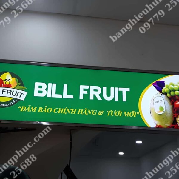 Làm biển quảng cáo hoa quả hộp đèn đang là xu hướng hiện nay. Loại biển này thường được làm bằng chất liệu Mica hoặc Alu với mặt trước được cắt bằng máy laze hoặc CNC nên có độ chính xác cao. Hệ thống đèn Led chiếu sáng hiển thị hình ảnh và nội dung rõ nét khơi dậy sự tò mò, ham muốn sử dụng sản phẩm.