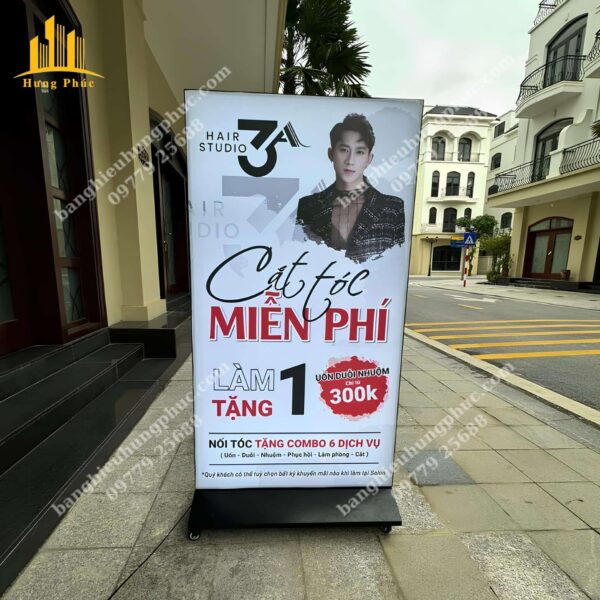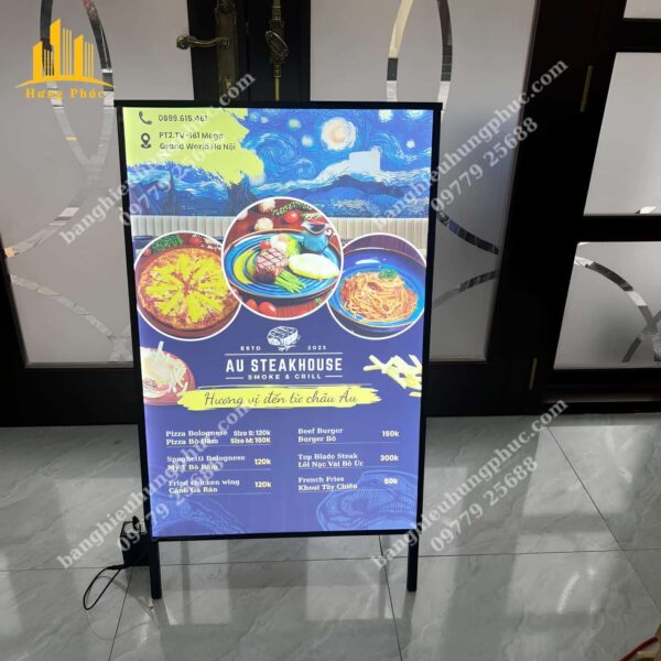 | Biển Vẫy Đứng Chữ A 2 Mặt Có Đèn LED, Tranh Backlit Film in UV | Kích thước 50x70cm, Giá: 2.300.000 VND. Kích thước 60x90cm, Giá: 3.200.000 VND. Kích thước 60x120cm, Giá: 4.300.000 VND. Kích thước 80x120cm, Giá: 5.100.000 VND. |