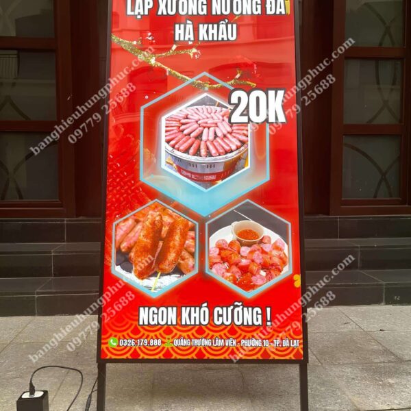 | BIỂN VẪY ĐỨNG CHỮ A 2 MẶT CÓ ĐÈN LED SÁNG NỘI DUNG. TRANH BACKLIT FILM IN UV, CHÂN CAO TỪ 30-50 cm | Kích thước: 50 x 70 cm, Giá: 2.330.000 vnđ |