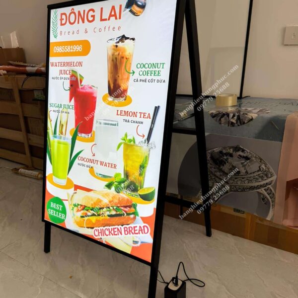 Khung: Toàn bộ được cấu thành từ nhôm. Hộp đèn có độ dày là 10cm. Mặt: Cả hai mặt đều là hộp đèn siêu mỏng, được trang bị kính cường lực dày 3mm, có khả năng chịu va đập tốt. Nguồn điện: 24V. Phụ kiện: Bao gồm bánh xe giúp dễ dàng di chuyển và hộp chứa các thiết bị kỹ thuật. |